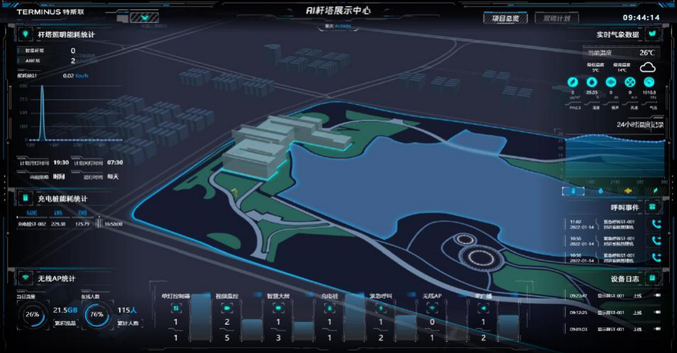 AI PARK安装特斯联自研智慧杆塔,将照明、摄像头、LED屏、环境监测设备等融合搭载在杆塔上,能够将设备数据传输至TacOS平台,也能够根据全场景模型激活室外自动照明、广告投放、安全应急等服务。