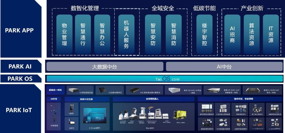 AI PARK以最小可用单元的方式,通过物联网、大数据、人工智能、云计算等创新手段,贯穿云边端全栈技术,基于TacOS城市级操作系统,覆盖智能安防、智能通行、智能停车、智能办公、机器人服务等多个城市核心场景,为园区管理者、入驻企业、员工、访客等带来数字孪生园区运营、“安消”一体化、节能低碳智慧办公、机器人协同等跨场景的服务联动与业务协同,整个园区AI赋能的科技价值随处可见,极富创意的沉浸式智能美学的愉悦体验由此开展。