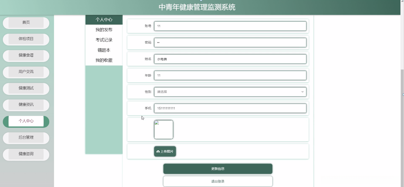 在个人中心界面中填写账号信息包括密码及详细内容如姓名年龄性别等以及上传图片和手机等设备信息以便完成个人信息更新。根据个人需求可以选择发布考试记录错题本收藏等各项操作如图5-6所示