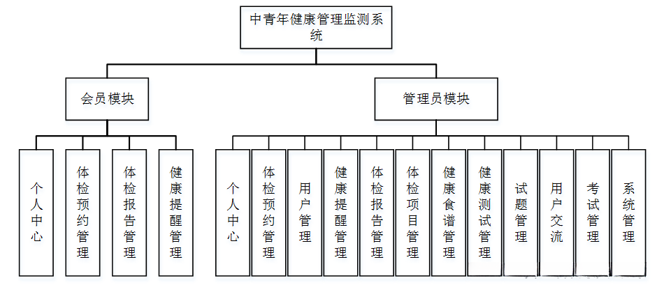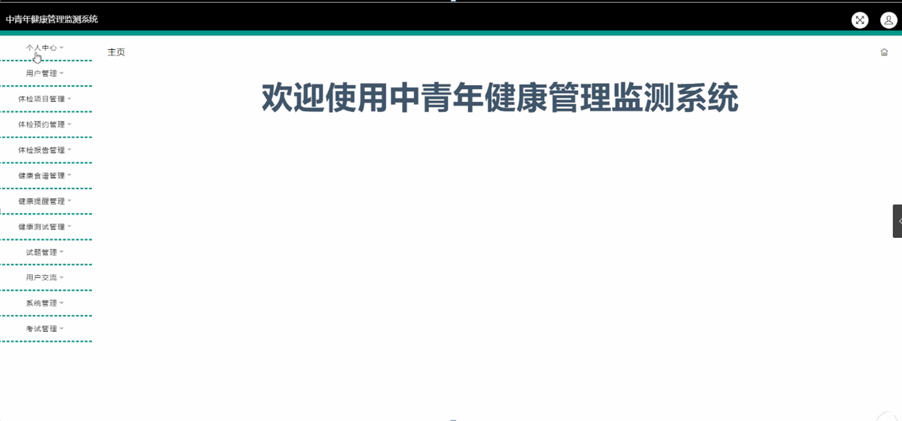管理员登录后可访问中青年健康管理监测系统的个人档案,并浏览以下功能模块:包括但不限于个人档案查询与编辑(个人档案)、基础信息维护(用户信息)、健康管理项目列表(体检项目 Management)、健康检查安排记录(体检预约 Management)、检查记录查询(体检报告 Management)、膳食计划查询(健康食谱 Management)、健康管理预警信息查看(健康提醒 Management)、身体评估记录查询(健康测试 Management)以及考试准备资料查阅(试题 Management)。此外还可以参与互动交流平台使用(用户交流)并完成系统功能配置与设置(系统 Management)和考试安排设置(考试 Management),如图5-8所示。