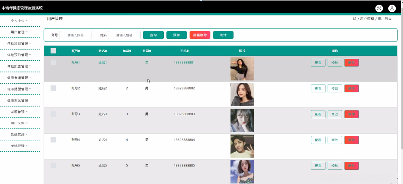 管理员在用户管理界面能够浏览账号信息包括但不限于账号ID姓名年龄性别相片以及手机号码等详细资料并根据实际需求完成新增更新汇总或删除等操作如图5-9所示