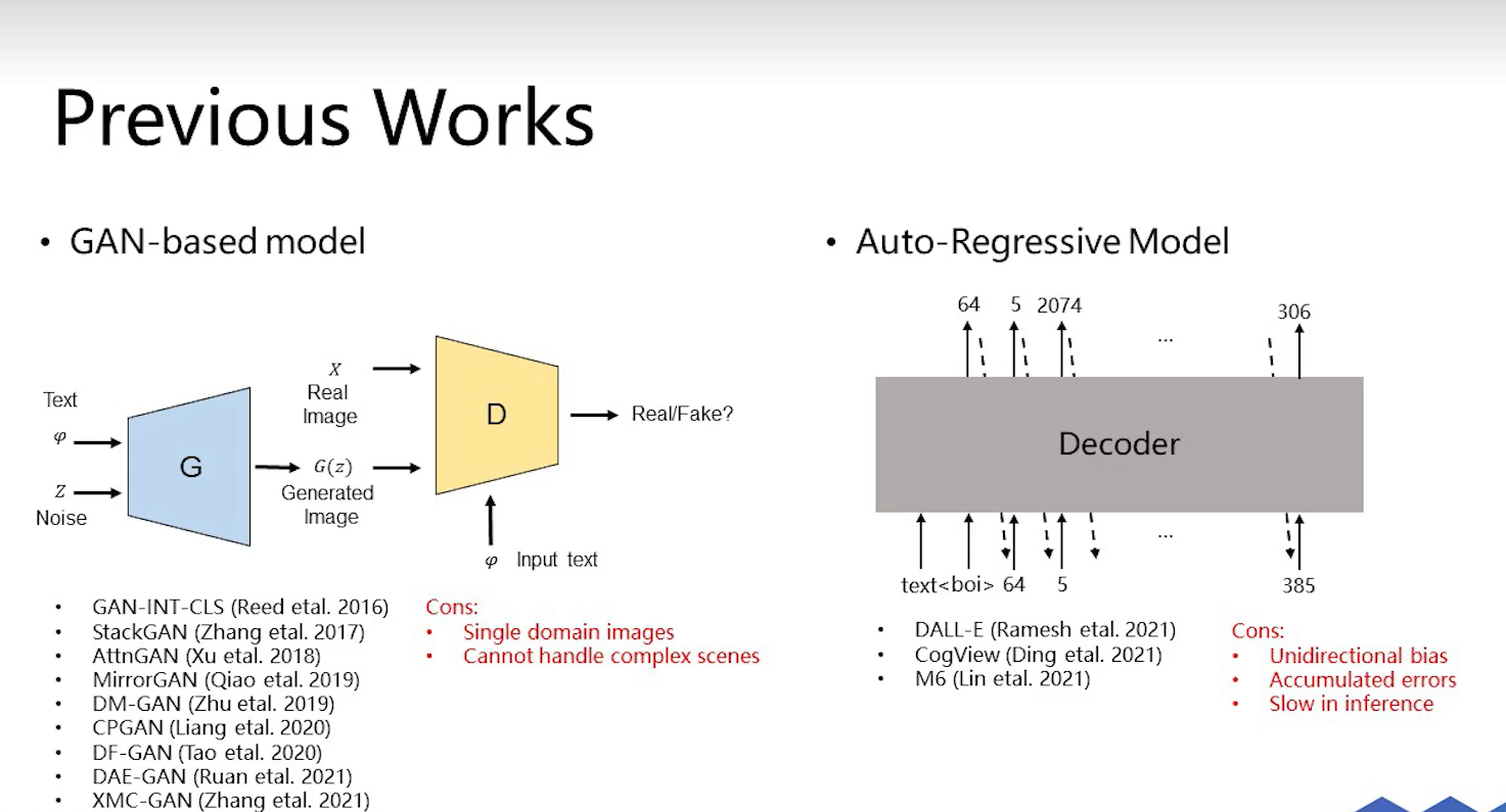 基于GAN的方法在2021年前就已经被广泛采用,在实际应用中通常会将输入文本与噪声一起输入到生成网络中,并通过其产生的输出来模拟真实数据分布特性。这种方法存在两个显著局限性:首先,在模型架构设计上具有较强的限制性,在特定领域应用时往往难以满足多样化需求;其次,在模型训练过程中由于缺乏对复杂场景关系的有效建模能力而导致训练效果欠佳。相比之下,DALLE系统针对输入的一段文字内容能够实现自动生成的过程。具体而言,该系统会从图像左上角开始逐步向右下方填充,每个区域都按照一定的规则进行处理,从而构建出完整的图像内容。然而,这一模式下存在明显缺陷:一方面,前一token出现错误可能导致后续生成效果严重偏差;另一方面,这种模式下生成速度也较慢。