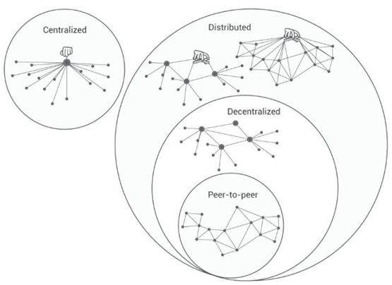 在传统的认知中,中心化的对立面就是去中心化。这里首先要纠正一个观点:中心化的反义词应该是非中心化,即分布式。从上图可以清晰地看出中心化(Centralized),分布式(Distributed),去中心化(Decentraliazed),点对点(Peer-to-peer)的关系,去中心化仅仅是分布式的一种。