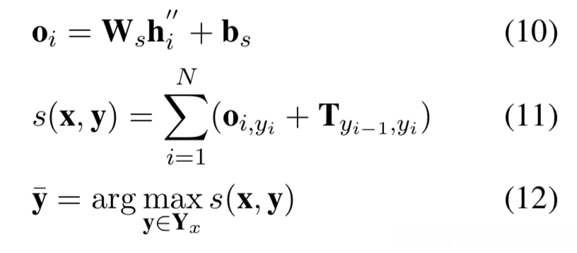 W和b被定义为可训练参数(即表示为矩阵形式)。o被设定为初始概率分布,o则代表状态转移概率分布,而yi则对应第i个词的标记结果。随后,我们选择使式(11)值最大的y值,即得分最高的标记结果,通过维特比算法进行解码,从而完成整个标注任务
