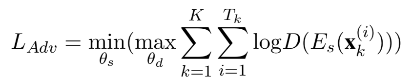 阐述了诸多内容后仍未提及对抗学习相关内容。具体而言,在这一部分实现是通过引入对抗学习技术得以实现的。其目的在于保证在多任务学习过程中不会让各任务特性干扰共享网络的学习效果。该部分涉及到的关键计算公式如下: