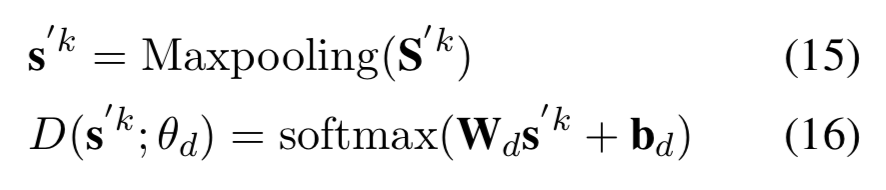 第一步将经过atten作用后的输出结果执行max pooling操作;随后将其输入到softmax层中,并乘以预设权重后再加一个偏置项以完成分类任务;具体来说,在这一模块中我们旨在识别输入的句子来自哪个特定的任务。