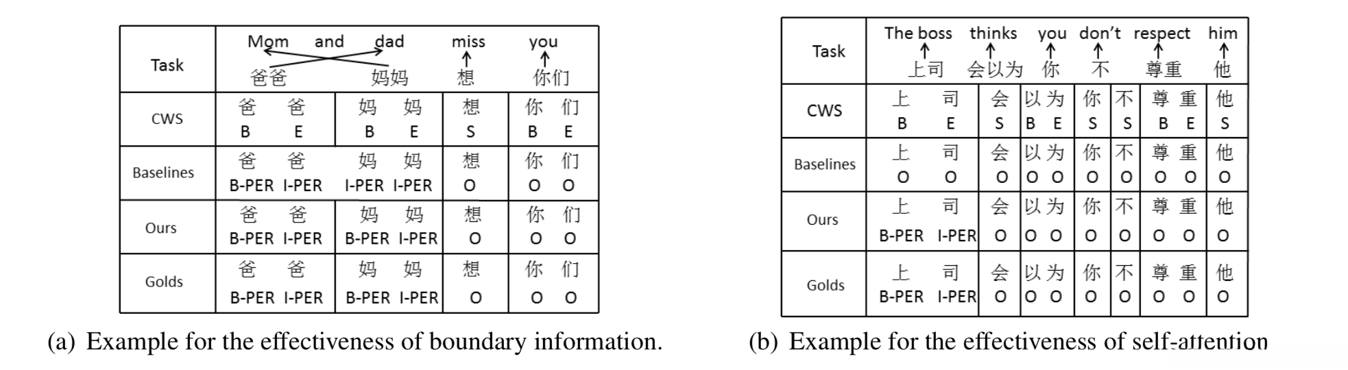 作者列举了两个具体实例作为支撑论据:其一基于词边界信息引入的方法;其二是采用了自注意力机制的技术方案。值得注意的是该研究亦未展开后续实验以验证这一结论(鉴于神经网络解码难度的问题)因此此结论尚具争议性)。如对这一研究方向感兴趣可进一步深入探讨