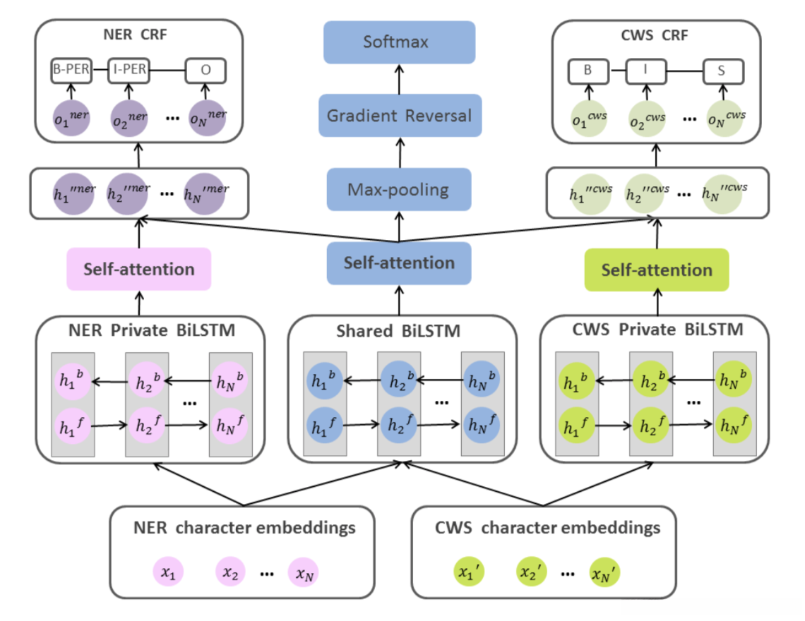 模型结构看起来复杂多变但整体设计思路清晰其中embedding层是基础组件其中不同的任务是单独对应的任务类型例如NER专用或者CWS专用系统分别采用不同的路径进行处理其中NER相关的嵌入会被输入到对应的BiLSTM结构中同样地分词过程也会采用共享BiLSTM架构以实现统一处理机制经过AtrousConv1d后会连接一个self-attention模块以便捕捉长距离依赖关系随后系统进入解码阶段通过CRF层实现最终分类目标即完成NER或CWS任务在此过程中共享层承担着实现对抗学习的关键功能因此后续连接部分会产生一个对抗损失函数用于优化训练过程经过max pooling后进行梯度反转操作(对于不了解这一技术的读者建议查阅相关资料以更好地理解其作用)随后应用softmax函数对结果进行概率分布预测其中softmax层的作用是判断当前处理的是命名实体识别还是词边界划分任务(两者在训练时被独立优化)