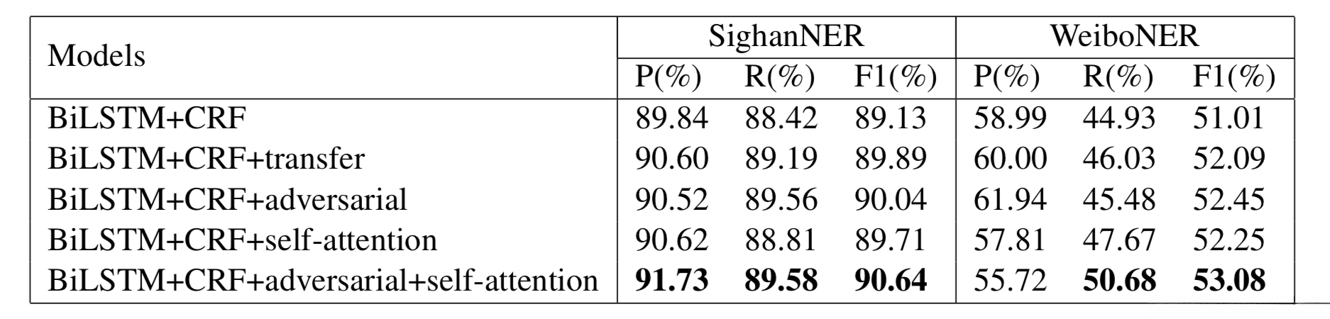 随后作者进行了实验分析,并将各个组件逐一拆解以便于阐明各组件的功能表现。基于此设置了多个基准模型包括基础的BiLSTM-Tagger-CRF体系以及其在不同方面的拓展优化版本如引入分词机制对抗训练机制以及自注意力机制等