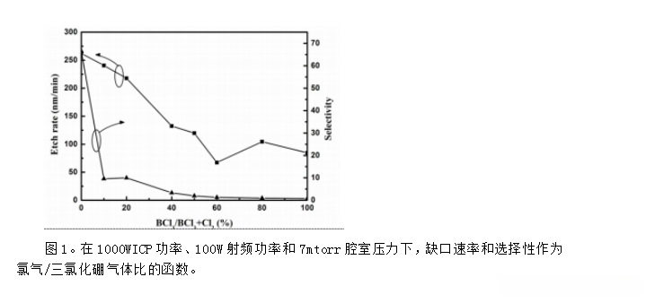 通过查看图1可以看出,在设置为1000瓦电感耦合等离子体功率、射频功率为100瓦以及室压为7托的情况下,该样品表现出良好的蚀刻速率和对二氧化硅的选择性。通过查看图1可以看出,在不同三氯化硼浓度条件下进行比较分析时发现:随着三氯化硼含量的增长……在纯Cl2环境下获得的最佳值约为262纳米/分钟。当向纯Cl2环境中引入三氯化硼时……选择性显著下降至约66%左右。