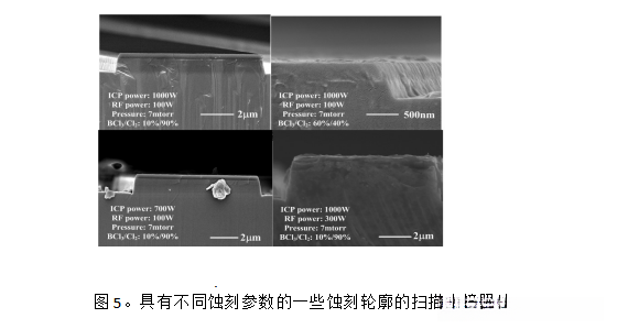 一些蚀刻剖面图如图5所示。结果显示不同。气体混合物中三氯化硼含量(%)的提高减弱了该工艺参数下的各向异性特征。通过实验发现,在相同条件下,