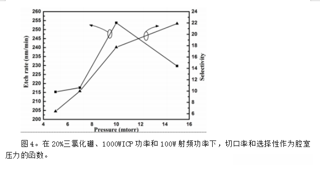 图2展示了ICP功率对蚀刻速率及选择性施加的影响。在该过程中,气体比例为BCl3占20%,Cl2占80%,射频功率维持7 mtorr不变。当将ICP功率调节至30至5 kV时(即从3 kV到5 kV),观察到腐蚀速度呈现上升趋势;但超过这一范围后,则出现速度下降现象。其初步增长与离子密度呈正相关(即随着I+浓度的增长)。然而,在进一步提高I+浓度后(即超过一定阈值),腐蚀速度反而出现了下降趋势;这可能归因于离子动能下降所致;同时实验还表明,在较高I+浓度下(即更高电场强度区域),材料的选择性显著下降