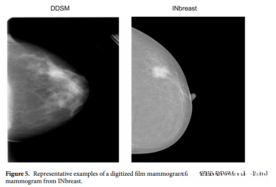 INbreast30 数据集是一个公共数据库,包含最近获取的 FFDM 图像。与 CBIS-DDSM 的数字化胶片乳房 X 光照片相比,这些图像具有不同的强度分布,如两个数据库的示例图像所示(图 5)。因此,INbreast 提供了一个绝佳的机会来测试整个图像分类器跨乳房 X 线摄影平台的可移植性。 INbreast 数据库包含 115 名患者和 410 张乳房 X 光照片,包括 CC 和 MLO 视图。