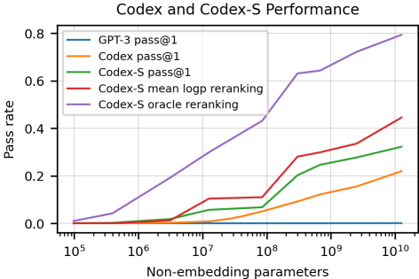 多轮生成策略:基于100个样本的生成过程中,Codex-S能够解决约77.5%的问题。采用具有最高平均对数概率的样本进行评估时,能够解决约44.5%的问题;而经过单元测试筛选出的样本进行评估,则能够解决约77.5%的问题。