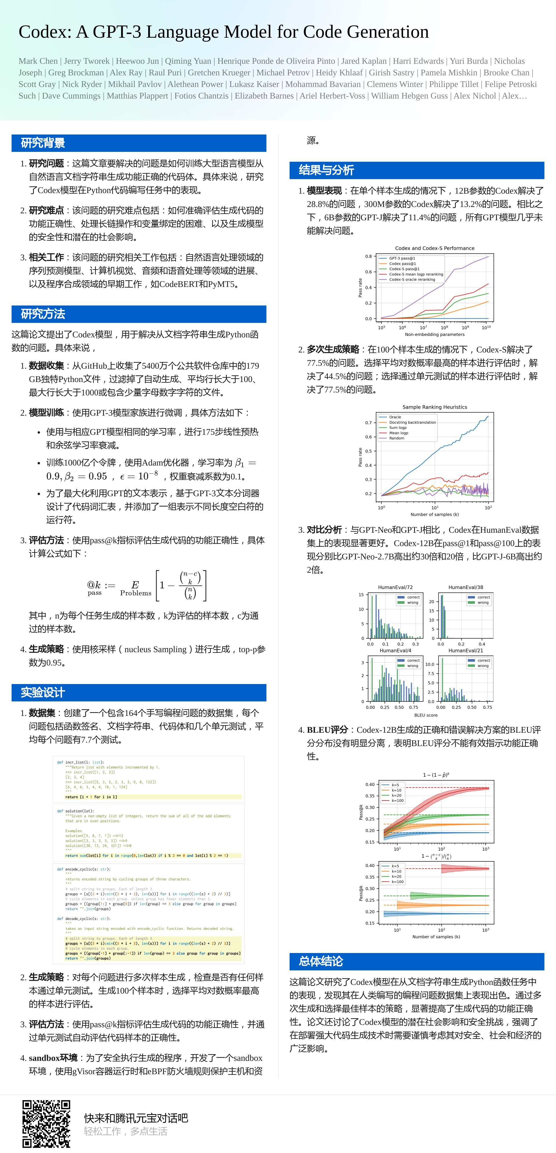 - 创新性的评估体系:提出了新的评价指标pass@k,并采用HumanEval数据集实现了自动化功能验证和测试。