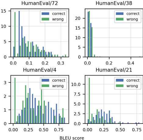 BLEU评价值:Codex-12B生成的正确与错误解决方案在BLEU评价值上的表现呈现相同趋势,并未显示出明显的区分度。这表明BLEU评价值无法可靠地反映解决方案的功能正确性。