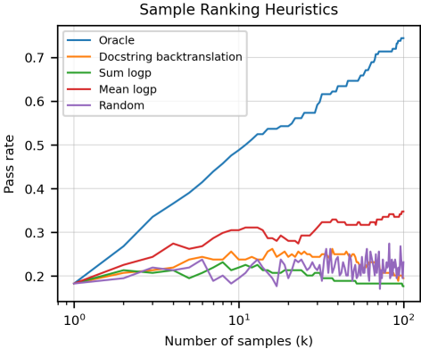 生成策略:为每个问题生成多个样本,并检查这些样本是否通过了单元测试。当生成100个样本时,在这些样例中选择具有最高平均对数概率的来进行评估。