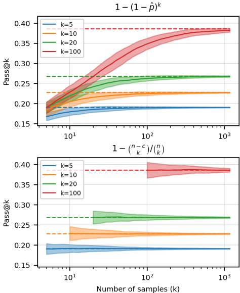 @k pass:=E Problems[1−(n−ck)(nk)] pass@k:= ProblemsE[1−(kn)(kn−c)]