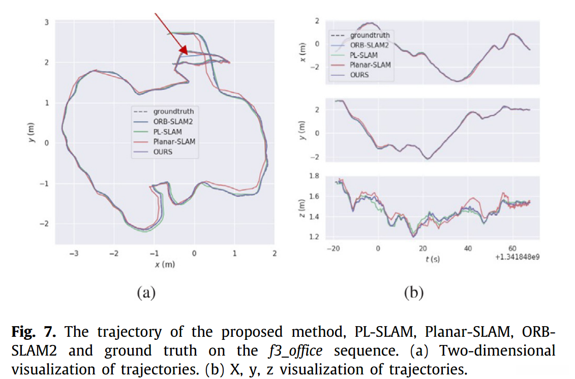 为了使性能更清晰,我们给出了零件序列的可视化。各方法在TUM RGBD f3_office上的可视化分析如图7所示。结果表明,我们的系统轨迹与地面真实情况基本吻合,PL-SLAM和Planar-SLAM总体漂移较大,ORB-SLAM2在箭头所示方向漂移更明显。图8显示了f3_st_near上的ATE,注意,在小场景中,PL-F SLAM的最小ATE也被控制在毫米级。