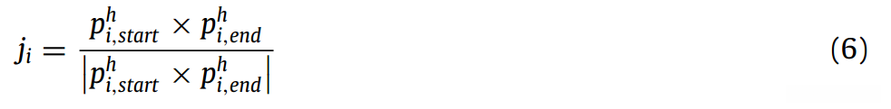 对于线特征,我们定义线Li的3D端点Pi,start,Pi,end∈R3以及它们在平面上的投影pi,start,pi,end∈R2,其对应的齐次坐标为phi,start,phi,end∈R3。根据后者,我们可以计算归一化的线系数,如公式(6)所示:
