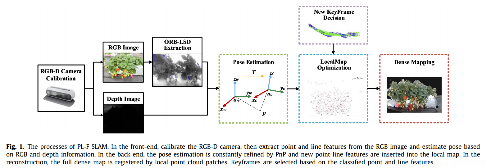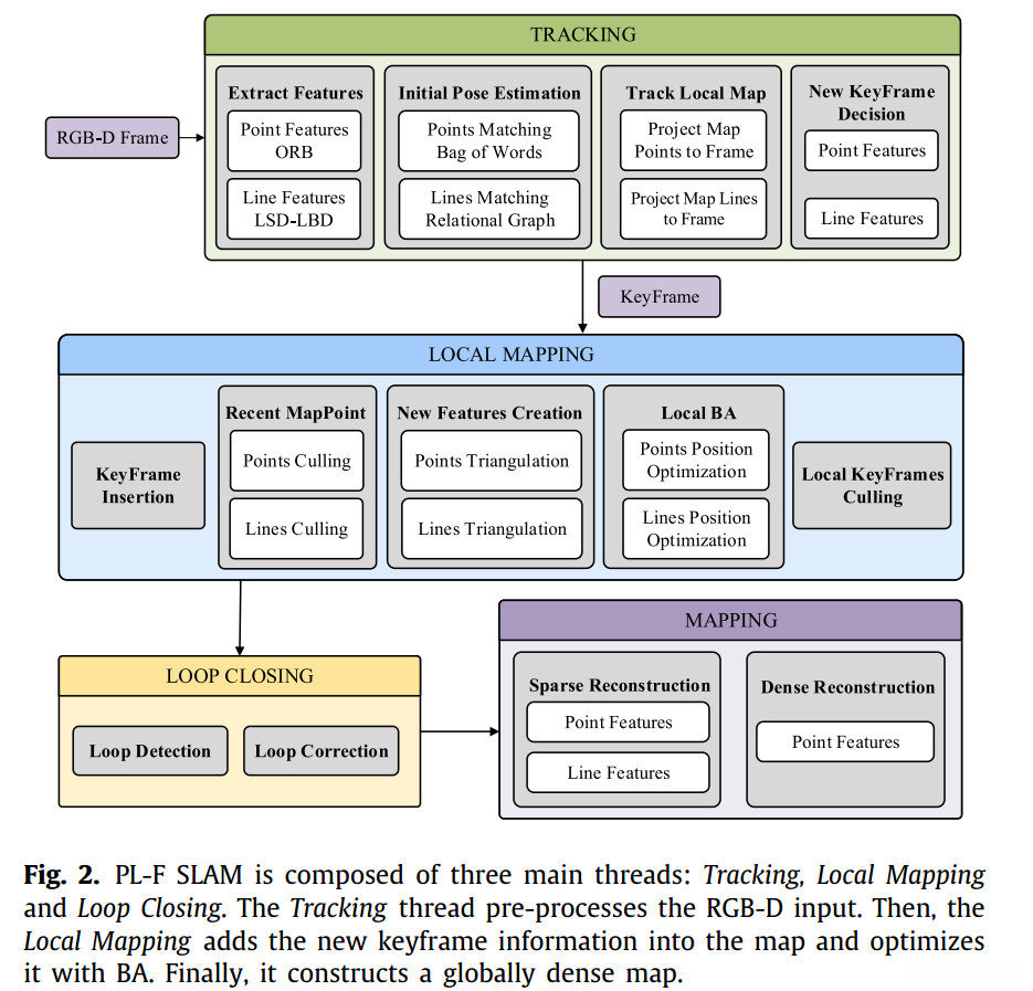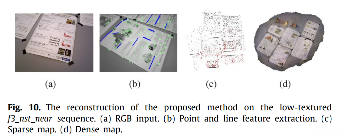 3、给出了一种基于点线特征融合的实时RGB-D SLAM的通用框架,其中这些组件用于低纹理场景下的高精度本地化和映射。