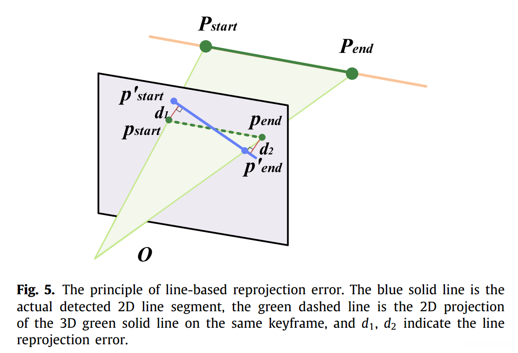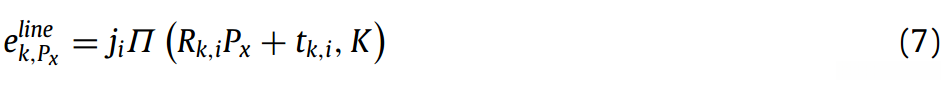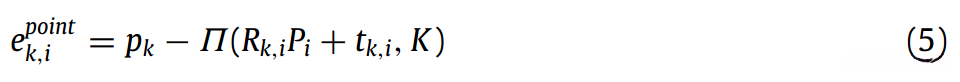 Translation estimation:旋转估计完成后,利用点线特征建立平移估计。对于点特征,我们将上一帧的3D点重新投影到当前帧中,并重新定义式(5)中的误差函数: