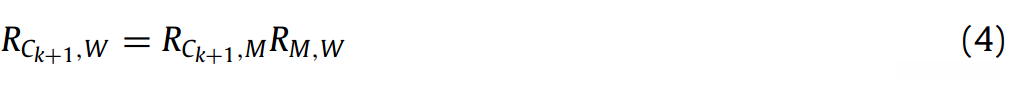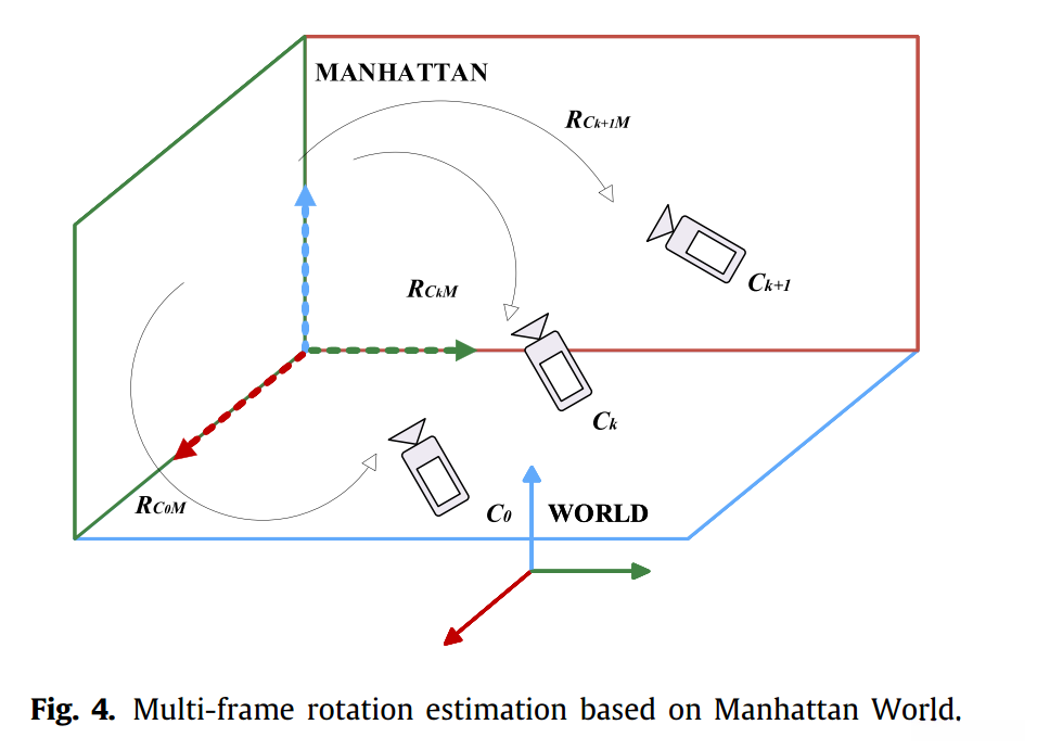 Manhattan Rotation estimation:MW假设场景模型包含三个相互垂直的正交方向,我们将像葡萄园这样的田野场景建模为MW。为了减少漂移并提高在田野等场景中的姿态估计的精度,我们使用MW建模来估计每个帧和曼哈顿坐标系统之间的旋转RCkM,而不是直接从帧到帧地跟踪摄像头。如图4所示,通过RCk+1,M将曼哈顿坐标系与相机的初始帧对齐,通过公式(4)获得世界坐标系下的姿态信息: