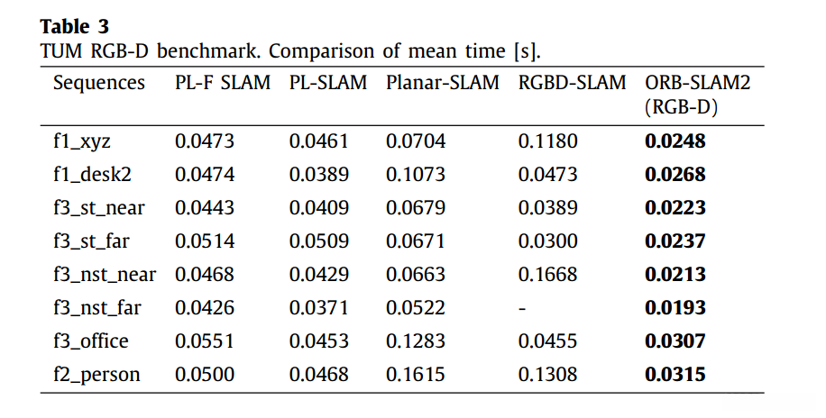 每个系统的平均跟踪时间统计如表3所示。结果表明,ORB-SLAM2算法由于只利用了点特征,在实时性上取得了更好的性能,这与基于pl的方法没有可比性。同时,在没有GPU加速的情况下,RGBD-SLAM与ORB-SLAM2相比性能较差。PlanarSLAM使用点、线、面特征来构建网格图,这大大降低了系统的实时性。PL-F SLAM和PL-SLAM在引入线特征时都增加了时间消耗,但与PL-SLAM相比,我们的方法以毫米级的时间消耗提高了轨迹精度(见表1和2)。