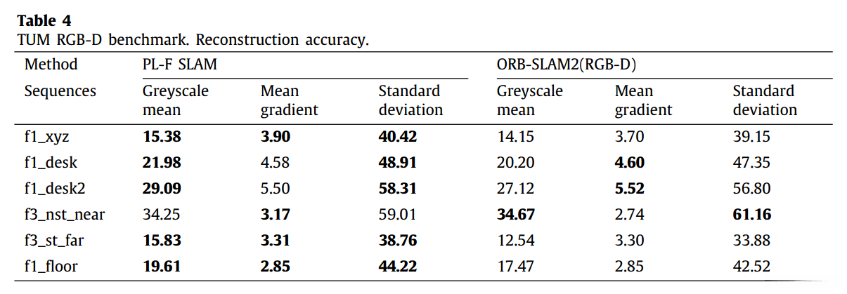 表4给出了我们的方法与ORB-SLAM2在重建上的定量比较。实验过程中,在f1_desk上,ORBSLAM2失败了三次,而PL-F SLAM成功了一次。从表4的统计数据可以看出,PL-F SLAM在大多数序列上表现出更好的效果,这证明基于我们方法的重建效果更符合真实场景。但是在少数序列中,与ORBSLAM2相比,图像的平均梯度降低了,我们推测我们的方法会导致过多的关键帧,导致点云重叠,图像清晰度略有下降。