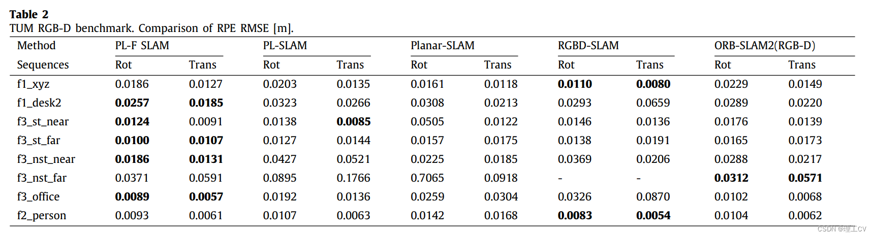 RPE comparison:表2显示了RPErot和RPEtrans RMSE在几个序列上评估所有方法的漂移。结果表明,PL-F SLAM的RPE普遍小于ORBSLAM2,表明我们的方法具有较高的定位精度和较低的总体漂移。低纹理大序列f3_nst_near的误差减小更为明显,而f3_nst_far的误差减小幅度较小。通过分析这些序列之间的差异,我们的方法在近距离序列上的RPE比在远距离序列上的RPE下降更明显,因为在近距离环境中有更多的关键帧。此外,与ATE结果相似,RPE结果表明,基于ICP的RGBD-SLAM在大多数序列中存在更大的轨迹误差。
