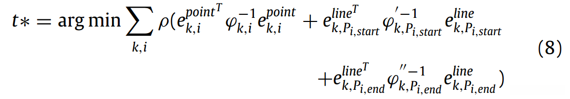 其中ρ是Huber鲁棒代价函数。ϕ ' k,Pi,start和ϕ ' k,Pi,end分别是与检测到的临界点和线端点的尺度相关的协方差矩阵。