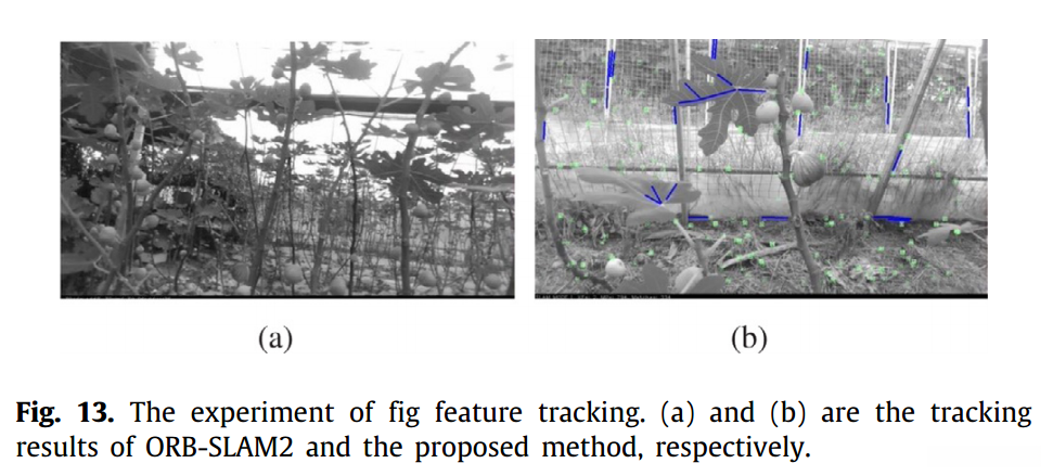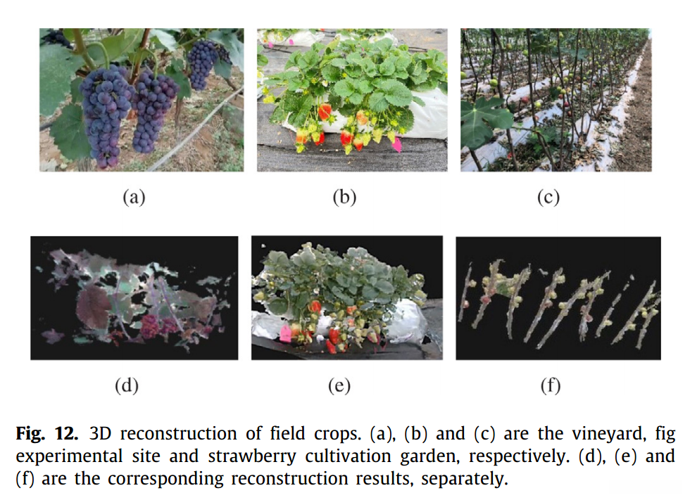 我们对比了PL-F SLAM和ORB-SLAM2,验证了我们的方法在田间场景实时重建的可行性,例如特征信息丰富的葡萄园、草莓栽培园和果实分布和树枝分布较为分散的无花果场地(如图12(a) -12 (c)所示)。