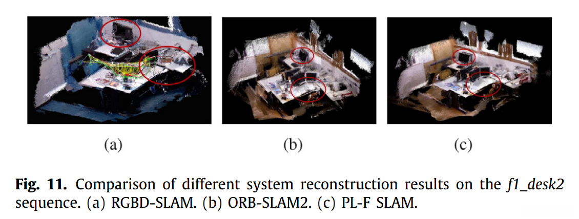 我们评估了系统的重建精度,稀疏和密集地图如图10所示,而我们的方法在低纹理序列上也能很好地工作。同时,我们将我们的方法与TUM RGBD f1_desk2上最先进的映射方法进行了比较,如图11所示。RGB-D SLAM是一个早期的工作,因此结果不如最近的工作,但我们的系统在密集映射方面表现出色,重构场景更加完整。