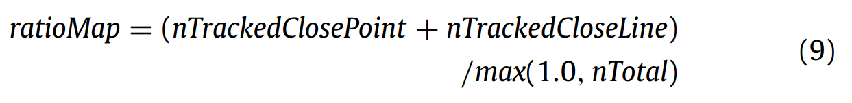 首先,我们设置最小阈值εp、εl作为已跟踪的近距离点线特征,并计算地图比率ratioMap作为插入新关键帧的标准之一: