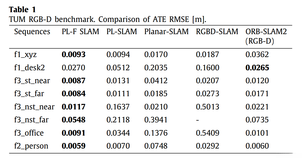 表1显示了TUM RGB-D数据集上的ATE结果。请注意,我们的PL-F SLAM平均比ORB-SLAM2减少19%的轨迹误差,并且在所有序列中表现优于其他框架。结果表明,在f1_xyz等纹理丰富的场景中,PL-F SLAM的ATE比orb -SLAM最大降低了74%。此外,我们在低纹理序列(如f3_nst_far)和大场景序列(如f3_office)中得到了很大的改进,其ATE都控制在毫米范围内。此外,我们的方法和ORB-SLAM2的ATE结果几乎在所有序列中都比ICP实现位姿估计的RGBDSLAM更好。
