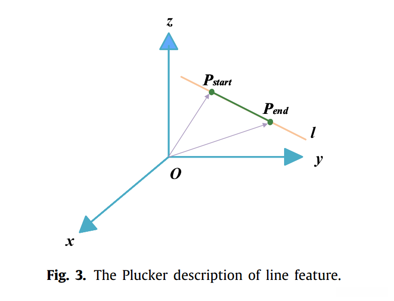 Point-line features extraction:我们的系统在由深度相机获取的RGB图像上提取ORB和线条特征。对于2D点pi =(uL,vL)和线li =(pi,start,pi,end),它们对应的3D点Pi和线Li是通过相机内参和深度图像的反投影获得的。对于每个2D点pi,我们将其深度值d转换为虚拟右坐标: