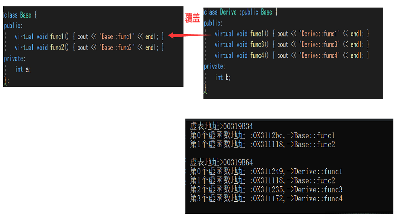 virtual void func1() {cout<<"Derive::func1" <<endl;}