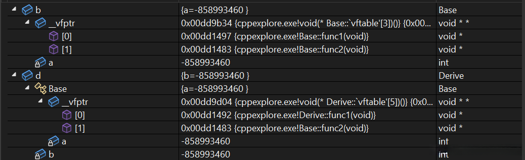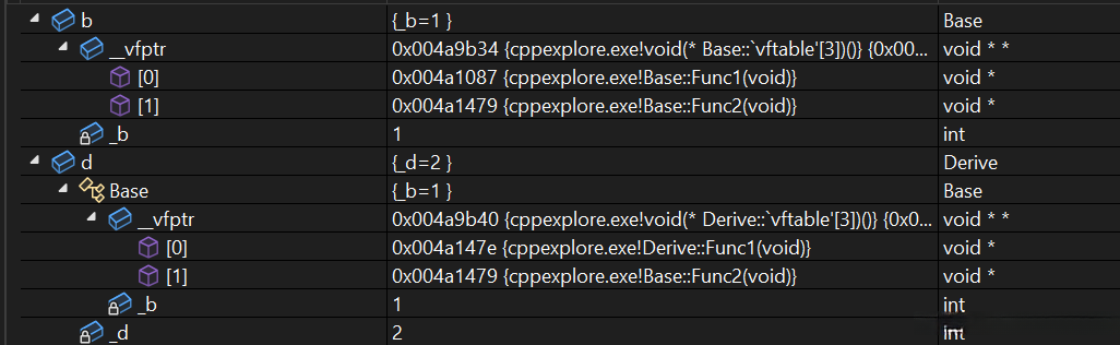 // 思路:取出b、d对象的头4bytes,就是虚表的指针,前面我们说了虚函数表本质是一个存虚函数