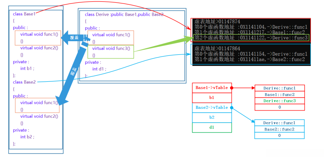 //由于Base1和Base2在被继承后是连续存放的,所以可以+sizeof(Base1)得到Base2部分的地址