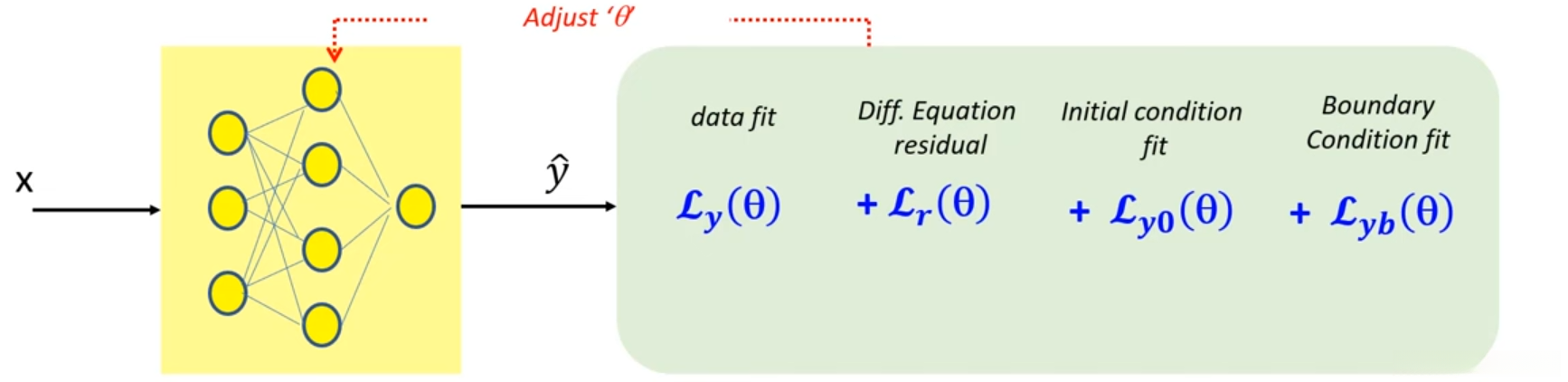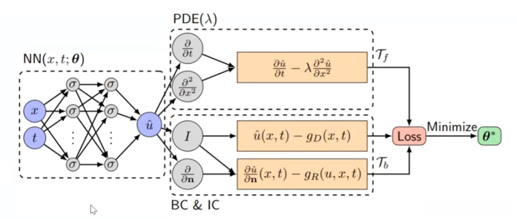 从理论上讲 PINN 可以表示为神经网络与物理定律的结合体。通过图示可以看出,在训练神经网络的过程中,其损失函数被分解成了四个关键组成部分:与训练数据对应的损失函数部分(即数据拟合项)、与微分方程求解相关的损失函数部分(即偏微分方程约束项)、满足初始条件相关的损失函数部分以及满足边界条件相关的损失函数部分。