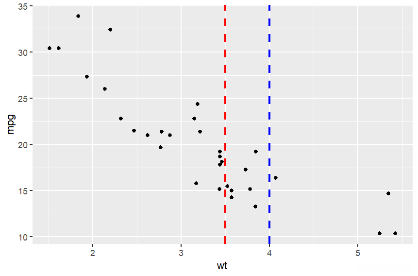 geom_vline(xintercept = c(3.5, 4.0), color = c("red", "blue"), size = 1, linetype = "dashed")