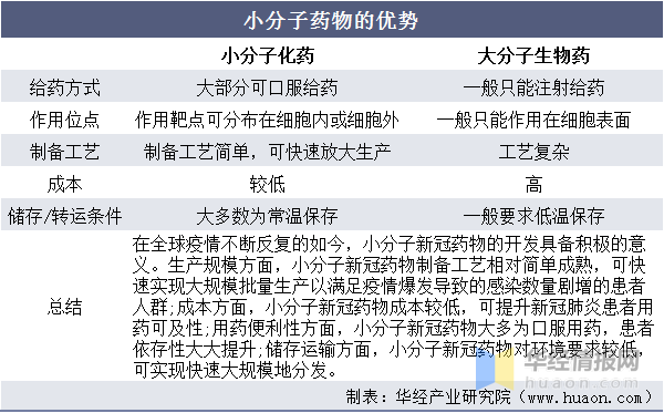 小分子药物相对大分子生物药有其独有的优势:(1)小分子药物作用靶点可分布在细胞内或细胞外,而大分子生物药一般只能作用在细胞表面;(2)大多数小分子药物可以口服给药,而正常情况下大分子生物药只能注射给药;(3)小分子药物制备工艺相对简单成熟,产量远远高于大分子生物药,成本也较大分子低;(4)小分子药物储存、运输环境条件要求较低,方便储存或运输;(5)部分小分子药物可通过血脑屏障而大分子生物药几乎不可能。