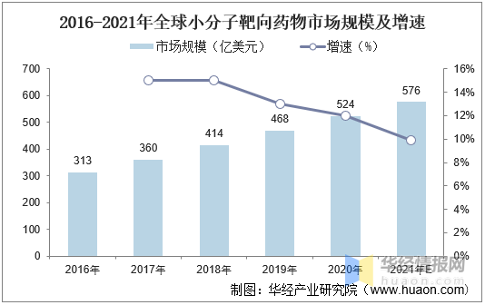 2016-2021年全球小分子靶向药物市场规模及增速