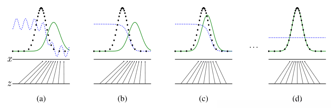 蓝色虚线是判别器D,绿色实线是生成器G生成的虚假数据的分布P(G),黑色虚线是真实数据的分布Px,下方的两个横线表示x=G(z)这个将噪声z映射到x的趋势。从a到d,随着迭代的进行,G的分布越来越接近真实数据,而D最后无法区分G和真实数据,变成一个定值0.5。
