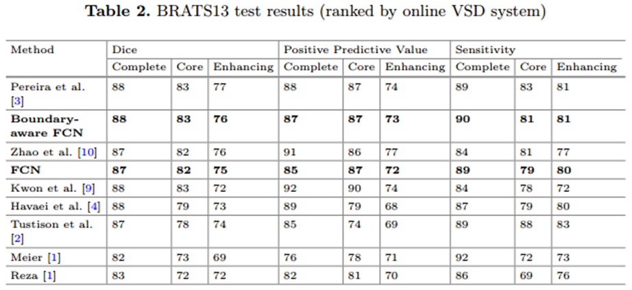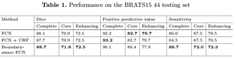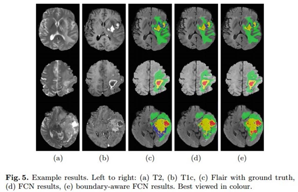 我们为脑肿瘤分割引入了边界感知FCN共同学习边界和区域的任务。它取得了最先进的成果并提高了BRATS13分段边界的精度,在BRATS15数据集与单任务FCN和FCN + CRF进行比较。它是排名最高的方法之一,计算成本相对较低。