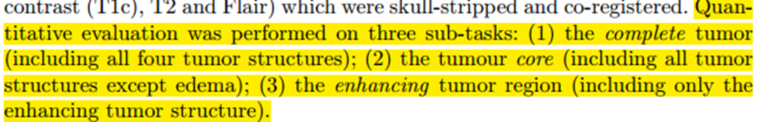 鉴于每个病例都有4中模态,所以本文在做评估时,将分割任务划分为三个子任务(1)对四种模态的肿瘤进行处理(2)只对脑肿瘤的三个核心区域进行评估(3)只对增强的脑肿瘤区域进行评估