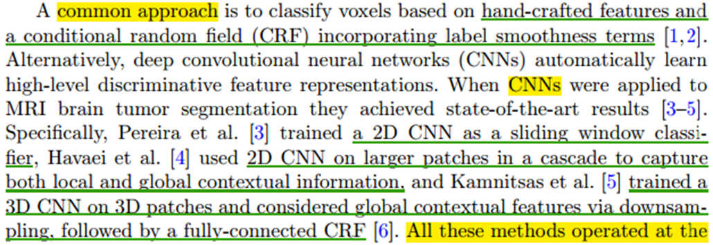 目前对于脑肿瘤分割的普遍方法:(1)手工构造特征+CRF (2)CNN(3)2D CNN作为滑动窗分类器(4)3D CNN + 全连接的CRF