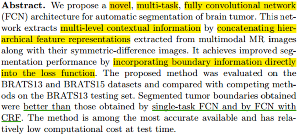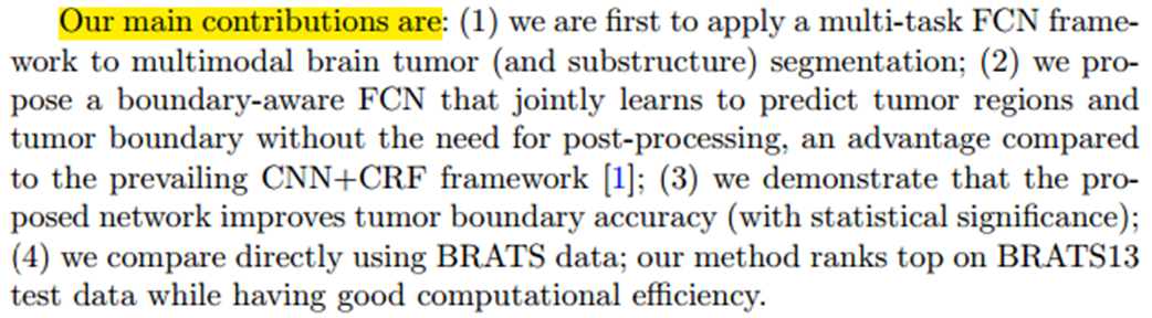 本文的主要贡献:( 1 )首先将多任务 FCN 框架应用于多模态脑肿瘤(和子结构)分割 ; ( 2 )提出了一种无需后处理步骤以及联合学习预测肿瘤区域和肿瘤边界的感知 FCN; (3)在统计意义上证明所提出的网络提高了肿瘤边界分割的准确性;(4)在BRATS数据测试;本文方法在BRATS13上排名第一,并且具有良好的计算效率。