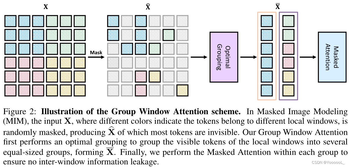 如图2所示, 本文提出了一种 组窗口注意力机制 , 将具有不同数量可见patches的局部窗口聚集成若干个 大小相等的组, 并在每个组中施加掩码注意力机制 (如图3所示)。
