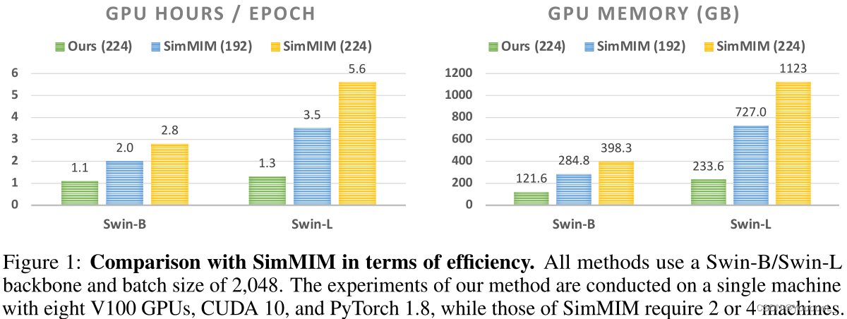在图 1 中展示的部分实验结果表明,在相同的计算资源下(即单台 V100 GPU 运行时采用了 8 倍加速策略),本文提出的方法显著优于对比的基础模型 SimMIM。值得注意的是,在单机环境下直接运行 SimMIM 模型时(即每张单机运行 2,048 张图像),由于其架构设计限制无法直接支持 [66]中建议的默认批量大小(即每张单机运行 2,048 张图像)。通过使用小尺寸图像降低了计算开销和内存占用后,虽然显著减少了训练时间和内存消耗(具体而言,在相同数量的训练周期内),但仍然无法赶上采用本研究方法所使用的较大尺寸图像(即基于 Swin-B 模型设计的方法达到了与基线相当的效果)。然而有趣的是,在采用更大的 Swin-L 模型时效率提升更加明显:例如,在与 SimMIM192 的对比中实现了加速比提升至原来的 2.7 倍。这一发现进一步凸显了本文方法在处理更大模型规模时的优势。